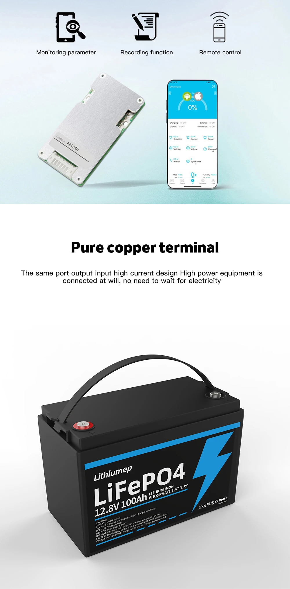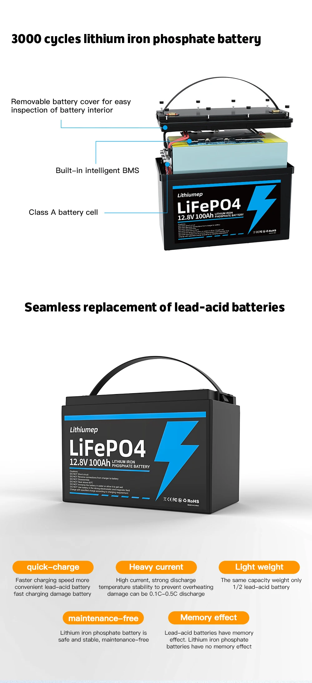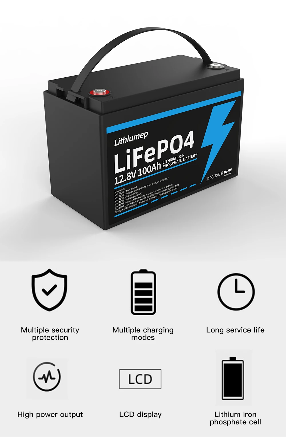 5. Higher safety: Lithium-iron phosphate chemistry eliminates the risk of explosion or combustion due to high shock, overcharge or short circuit conditions.